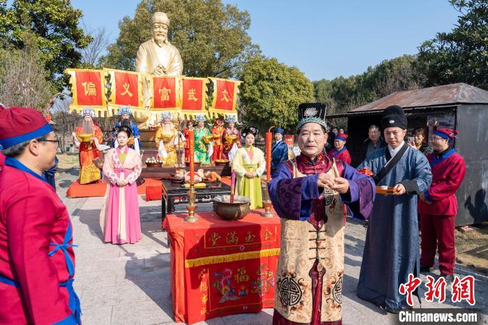 正月初五,周庄每年例行的迎财神仪式上,“沈万三”祈祷一年平安和顺。 中新网记者钟升摄
