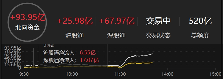 上证报中国证券网讯据Choice金融终端数据,截至1月11日13时42分,北向资金净流入超90亿元,达到93.95亿元。